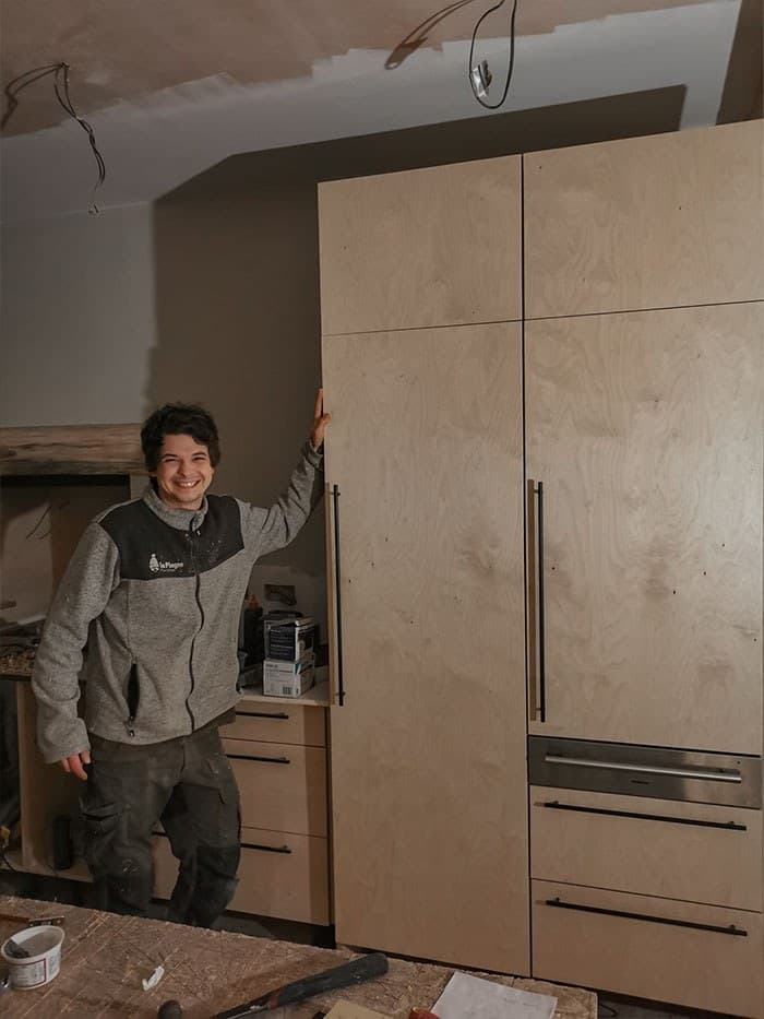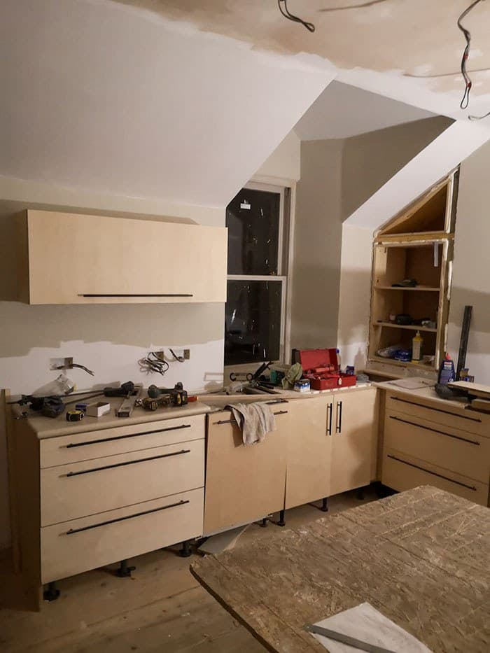 Cal, who has a carpenter background has already begun creating the carcasses for the kitchen units, building them out of plywood (an affordable and beautiful choice) with a hope that the kitchen would be durable and last a lifetime. With sustainability and house renovation costs at the forefront of their project it was crucial that their materials and labour reflected this. Paired with matt black hardware we think Cal’s done a stunning job creating a kitchen to be proud of.